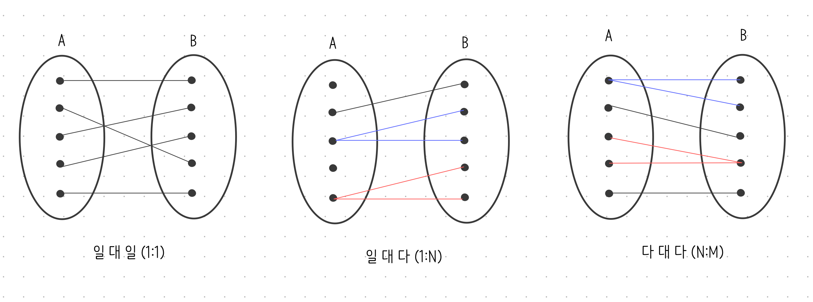 | 2. 일 대 다 (1:N) | A의 각 원소는 B의 원소 여러 개와 대응하나, B는 A의 원소 한 개와 대응 |
